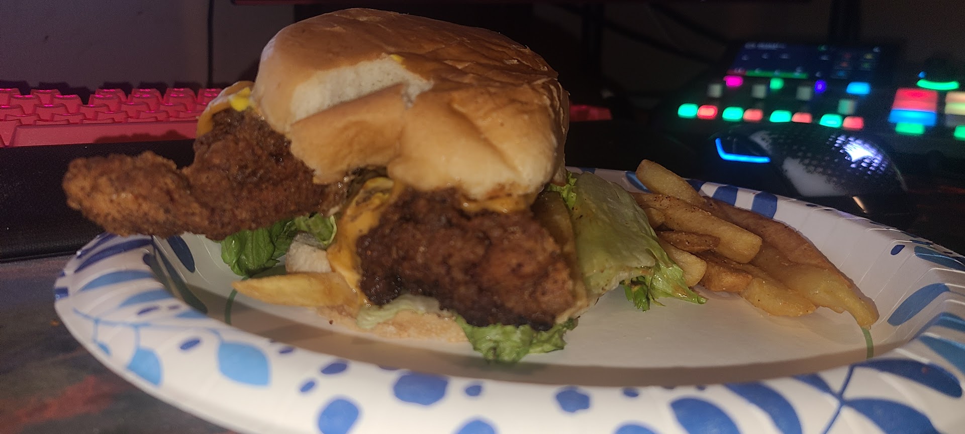 I got the buffalo chicken sandwich. The chicken was dry, and I'm not sure if the 'buffallo' was a dry rub or a sauce but I could not taste any on there. My bun was also very soggy and fell apart. Not a big deal, wish the sandwich alone was wrapped in paper. The portion was HEAFTY. You are def getting what you payed for.