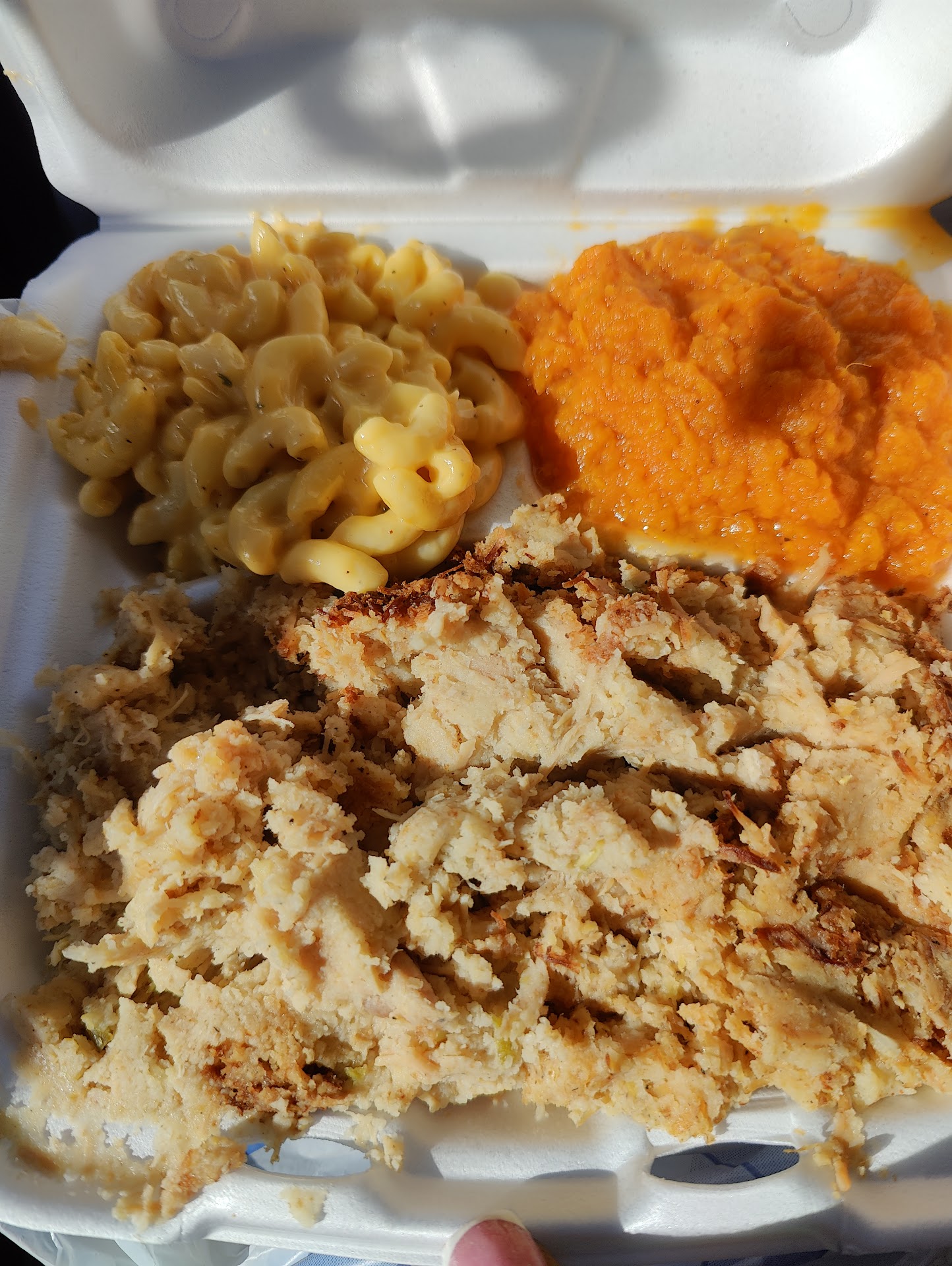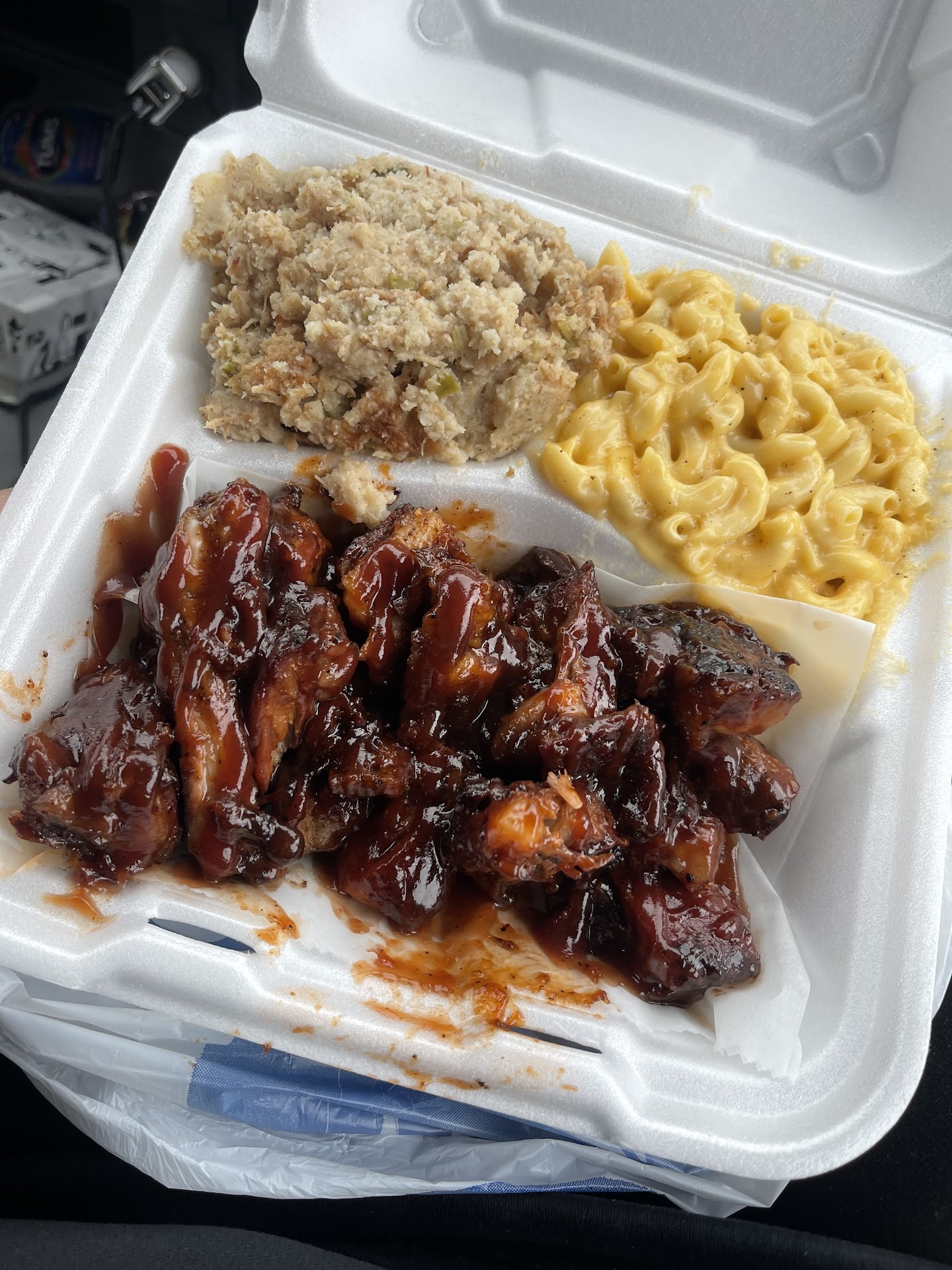 Great customer service from what my wife tells me the food not so great we're talking low-grade catering I ordered three separate meals catfish turkey dressing and ribs they all came with two sides first off the macaroni was not a traditional Thanksgiving style macaroni we're talking Golden corral Popeyes chicken macaroni the dressing was very dry and a little sweet not much flavor and little amounts of meat the greens were okay the yams taste canned smashed up not very sweet the ribs were so meatless I mean I'm getting bone with every bite very low grade they added a little Sweet baby Ray's the catfish was okay nothing special at all the portions were very small and the prices were ridiculous hi for the quality also portion size of the food my recommendation do not buy low grade poorly prepared food for high prices I cannot recommend this place to anyone but they were...