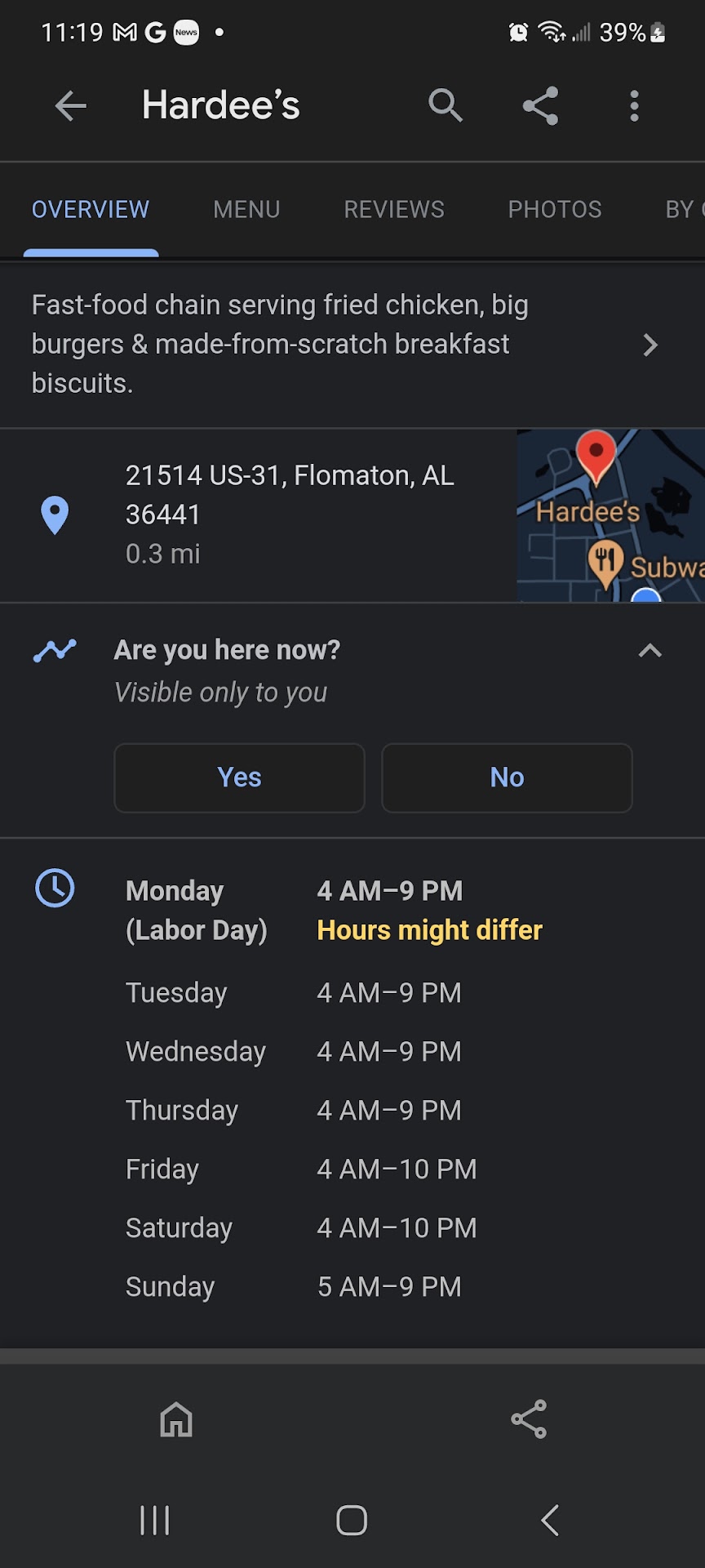 Read moreThis is the first Hardee's I have ever been in that was not clean....tables, floors, counters were all dirty along with windows. My Mom used the restroom and she said it was filthy and stunk real bad. It was not rush hour it was 3:30 in the afternoon. We were the only people inside. I ordered and it took approx. 5 minutes a little slow but I can deal with that. I asked for a large tea and was told "we are out" she did not offer to make any. She actually appeared stoned. My burgers came up and she bagged them and handed it to me, I reminded her that I ordered fries too. She said oh yeah and went and got them. She did apologize. I was a fast food manager for years and never would my restaurant have gotten so bad or my employees so lacks. I was truely embarrased to have taken my Mom there after talking about how good they are. It will be a while before I go back. This is the Hardee's in Flomaton. There were 2 employees only so for that time of day they were properly staffed and they were not rude just not service oriented or real friendly. I could not see the kitchen but going by the appearance of the front I would not be sure of its cleanliness. I do not like giving bad reviews but call it like I see it. Store definitely needs some attention both inside and out as well as some employee retraining. They definitely need someone who takes pride in their work and store!! It was...