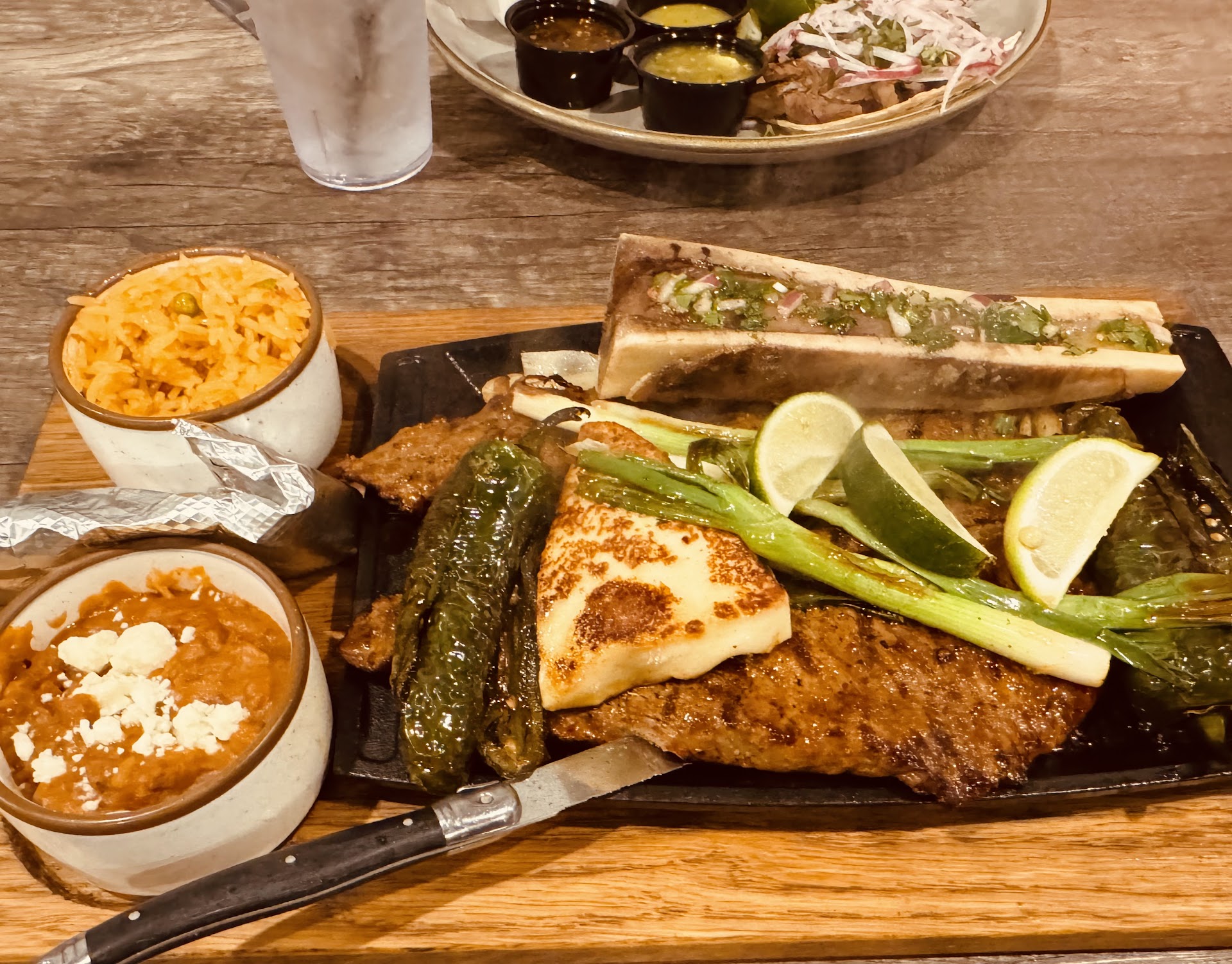 I had the Carne Asada with bone marrow, which was very good. The steak was the tiniest bit tough But had very good flavor. The bone marrow was delicious. The other two meals at our table were tacos and burritos. Both looked great. They had two different choices for the beans and although the refried beans that I got were good, the other ones, that look like Charro beans were significantly better. The service was good and everybody was very pleasant. When I got there, it was going on 7 o’clock and There wasn’t a single parking spot in the lot. They...