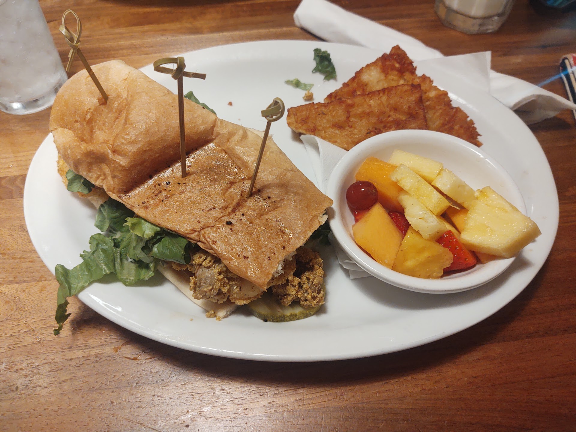 However, the food was overpriced, especially considering the quality. I got the oyster and shrimp po-boy, and it wasn't that good. It wasn't terrible, but I've had substantially better po-boys. 20$ for a bland po-boy and a tiny cup of fresh fruit is insane.