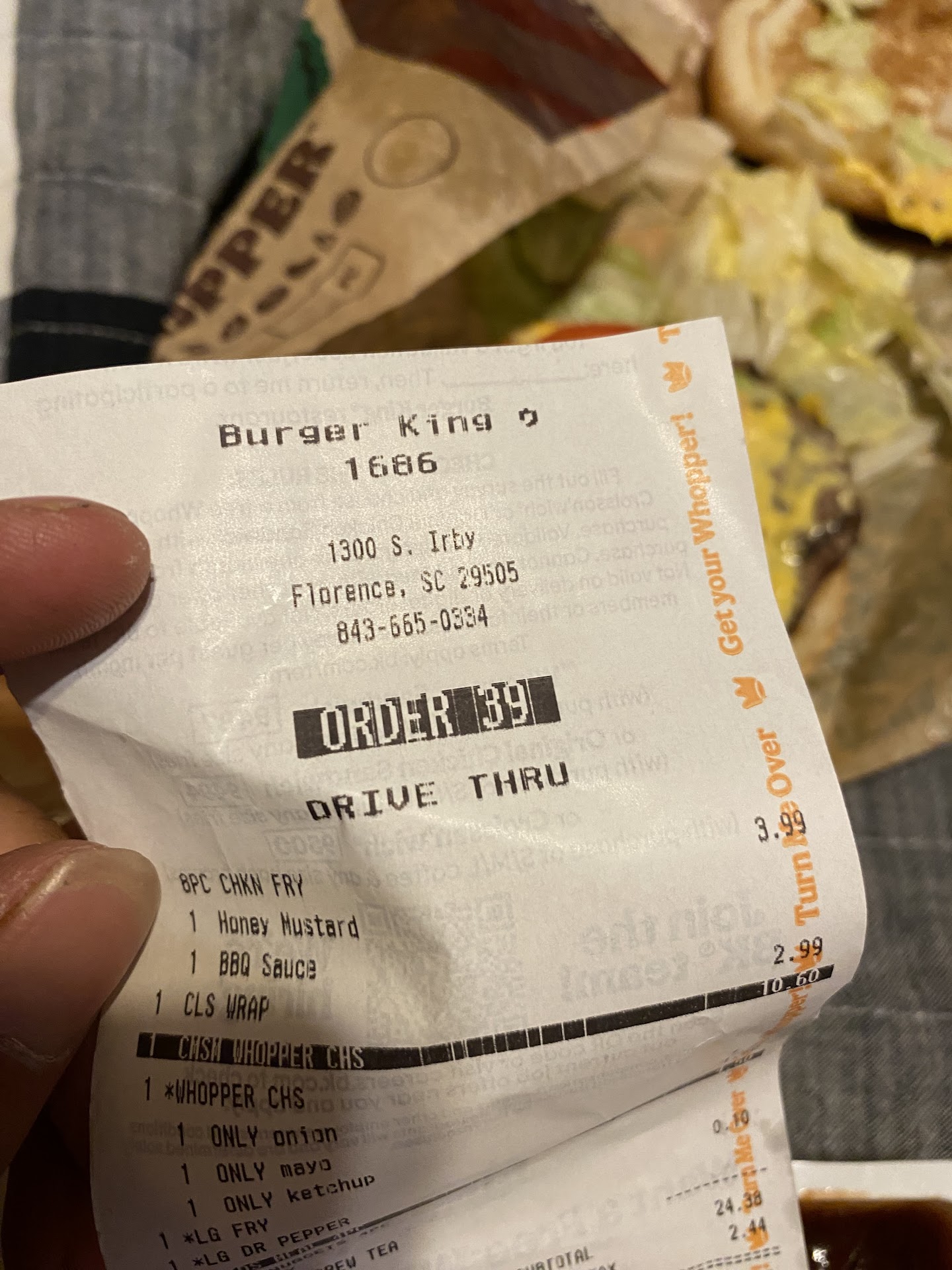 Read moreLemme preface this by saying, I've never been in this town before. I'm from NC; I brought a relative to Sexton Dental Clinic on Palmetto. It was 9:30 AM, I was beyond⦠PAST exhausted, and wanted some place with a drive thru. Wendy's was closed⦠it's the only fast food I like. McDonald's wasn't as close as BK, Wendy's, and Bojangles (yuck); plus, I never eat meat there, just the fries. Anyway, I decided on this restaurant because it was open, close by, and I enjoy eating BK's chicken sandwich (never the fries). I happened to read the reviews on this location because⦠they were there, I'm using Google Maps, whatever why not? Something told me not to eat here after reading some of the reviews, but I was like "Screw it. Everyone's experience is different." I had to get breakfast because it was so early; I didn't even know BK served that. My hash browns were trash browns. The chicken biscuit was ok. The NY cheesecake tasted like NY alright⦠the subway. I said all of this to say, it is now 1 PM and I am slumped over a public restroom toilet asking God to remove the evil spirit infested in my bowel. I would've been better off eating the bag of chips in...