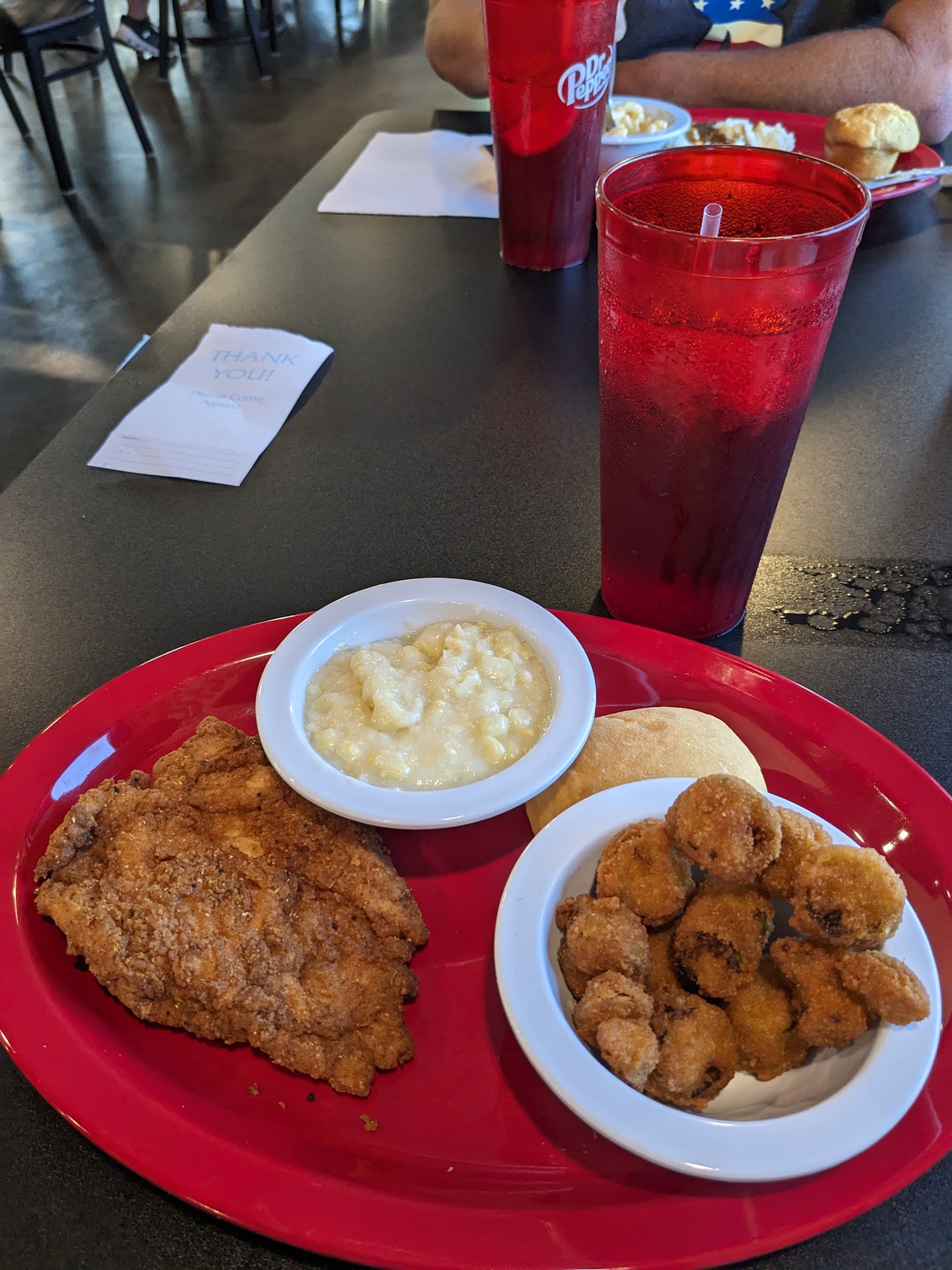 Read moreFirst time my husband and I ate here. Everything was overcooked and cold the fried okra was encrusted in a hard , very greasy , cold thick breading couldn’t even eat them. I was afraid I would break a tooth I didn’t even taste okra The Mac and cheese was also cold , unseasoned and the elbow pasta was way overcook. to the point, the pasta was soggy and the cheese in the Mac and cheese tasted like old dish water. My husband agreed ! We tried to complain and the checkout lady just shrugged her shoulder and said “ oh well , so what everyone likes it that way “. She didn’t seem like she cared at all and went back to fixing her nails , the grilled cheese sandwich tasted old like fake cheese was used. It made me and my husband very sick afterwards The only thing that was ok and we could eat was the creamed corn. The bill came to $30 for two sandwiches and three side vegetables with drinks Definitely not worth that much money ! Could have eaten at Cracker Barrel and got better , hot food for that amount of money and they would have made things correct , if the food wasn’t good , I know or they would have been thoughtful enough to discount something that was not fit to eat ! Never will we eat there again and we’ll spread the word about this place to others It would have been better if the lady who we talked to would have been sympathetic or even cared about pleasing her...