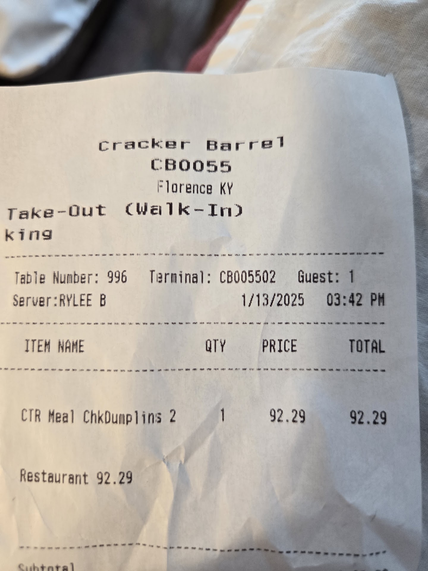 I WAS THERE ONCE AGAIN ON JANUARY 13TH AND SPENT OVER 90.00 GETTING A CATERING MEAL FOR 10 OF CHICKEN AND DUMPLING WITH EXTRA DUMPLINGS AND GREEN BEANS WITH BISCUITS, ONCE AGAIN THE MESSED UP MY ORDER, HOW MANY TIMES DO YOU HAVE TO COMPLAIN UNTIL SOMEONE LISTENS TO YOU. THEY DONT PUT ENOUGH SARAN WRAP AROUND THE DISHES AND THE WHOLE BOTTOM OF MY BAG WAS FILLED WITH ALL THE JUICE OUT OF THE CONTAINERS. IT RUINED ALOT OF STUFF, NOT TO MENTION THE PLASTIC THING THEY GAVE ME FOR THE CHICKEN AND DUMPLINGS COULD NEVER SERVE 10 PEOPLE, I COULDNT BELIEVE IT WHEN I GOT HOME, AT LEAST THAT USUALLY COMES IN AN ALUMINUM FOIL CONTAINER AND IS PRETTY LARGE. I ATE ONE BOWL OUT OF THAT CONTAINER THAT WAS SUPPOSED TO SERVE 10 PEOPLE AND HALF THE CONTAINER WAS EMPTY. I WOULD BE MORE THAN WILLING TO BRING THAT PLASTIC CONTAINER BACK AND THE BAGS FILLED WITH THE JUICE TO SHOW THEM. I SAVED THEM JUST SO I COULD SHOW THEM HOW I GOT IT. WHY WONT ANYONE LISTEN. I SPEND ALOT GETTING THESE 10 PERSON CATERING MEALS AND THEN ITS DISASTER WHEN I GET HOME. IVE GOTTEN THESE CATERING MEALS NUMEROUS TIMES AND THEYVE ONLY DID IT RIGHT ONCE OUT OF 8 TIMES. I LOVE THE FOOD BUT THEY CANT PREPARE TAKE OUT WITHOUT MAKING IT A DISASTER. THEY ONLY PUT SARAN WRAP ON THE TOP INSTEAD OF ALL AROUND THE CONTAINERS AND ALL THE JUICES LEAKED OUT ALL OVER THE BAG. THE LAST TIME I COMPLAINED THEY SENT ME A LINK ASKING HOW THEY COULD MAKE IT BETTER, THEN NOBODY EVER GOT BACK TO ME. I've complained but it keeps happening so I guess complaining doesn't help. I do love the food and the atmosphere but I don't want to worry about my order each time I go. That's alot of money to spend for takeout so it should be right. I have also eaten in numerous times. First place I went as soon as I got out of the hospital after a procedure. Hadn't eaten in 36 hours and they said what do you want to eat and they knew before I answered, they said Cracker Barrel and I said, you know it. CRACKER BARREL SENT ME A LINK TO ASK ME HOW TO MAKE IT BETTER, THEN I TILD THEM HOW. THEN THEY COMPLETELY IGNORED ME AND DIDNT EVEN HAVE THE COURTERSY TO GET BACK TO ME. ITS TRULY VERY SAD THAT THEY GIVE YOU A LINK TO GET A HOLD OF THEM THEN WHEN YOU DO AND RESPOND TO THE LINK, THEN THEY COMPLETELY BLOW YOU OFF AND IGNORE YOU. THATS EVEN WORSE THAN THE SERVICE I RECEIVED, NOW I UNDERSTAND WHY THE RESTAURANT EXPERIENCE WAS SO BAD IF THEIR CORPORATE OFFICE TREATS CUSTOMERS THAT BAD NOW I KNOW WHERE THE RESTAURANTS GET THE BAD...