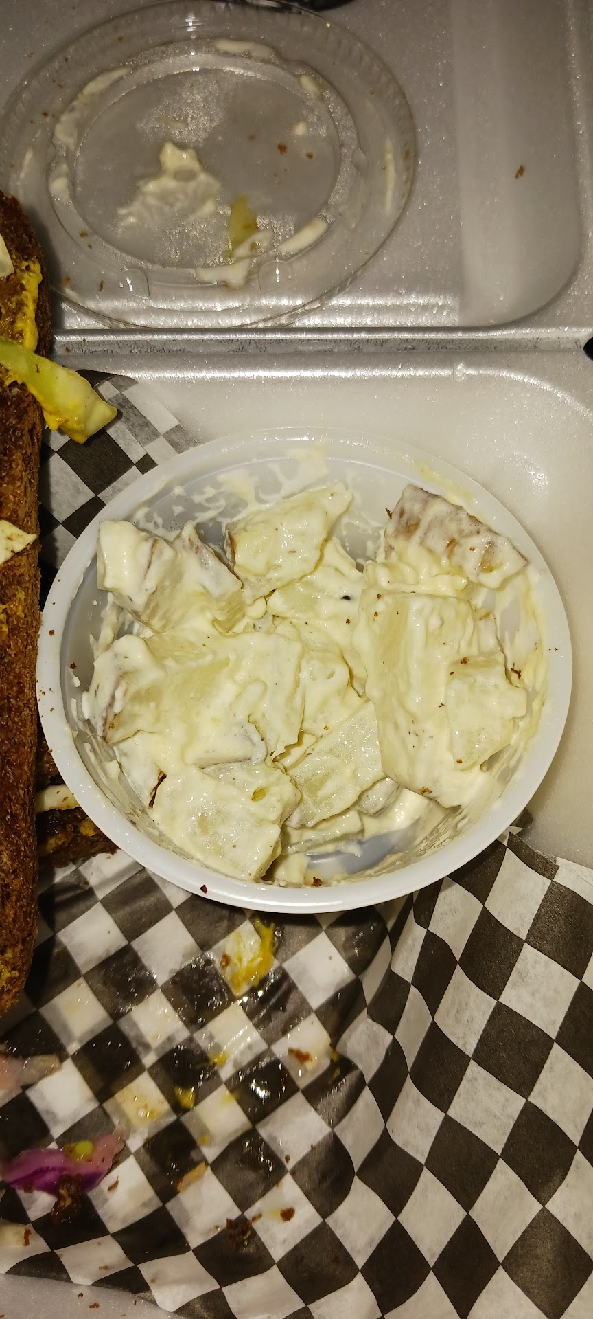 The Bad: It was my first time, I obviously stuck out because the guy made me out and asked if it was my first time. I told him it was and thanked him, got my food, and left. As you can see, I didn't experience what others did in their photos that I looked at online before I went. I couldn't believe that there wasn't any meat to speak of on the one side. I had to end up redistributing some of the meat from the other side. And as you can see, there wasn't much to work with there. I am for creativity on sandwiches and I read that there was a coleslaw on the Reuben instead of the traditional sourkraut, but I thought it would've been a better coleslaw than just a regular coleslaw and it missed its mark. A Reuben isn't a Reuben without it, and it didn't have any thousand island sauce, so I'd think about renaming to a creative version of it or something, but I was expecting a Reuben. On the potato salad, the potatoes were just barely done for me and could've been cooked a little longer. It felt more raw potato than a traditional mushy style, but this is pure opinion. I feel you could offer larger drinks if you're only offering bottles and not fountain drinks. Very fresh though because it was being made right there but having said that, it looked like he was teaching a worker how to make it and I felt knowing it was my first time, teaching someone the proper way, this sandwich could have been made better at least. There is talk of price, but as I said, I support small businesses. This meal was $16, and I like to see them get theirs, but I'm hoping I can get my money's worth in the future.