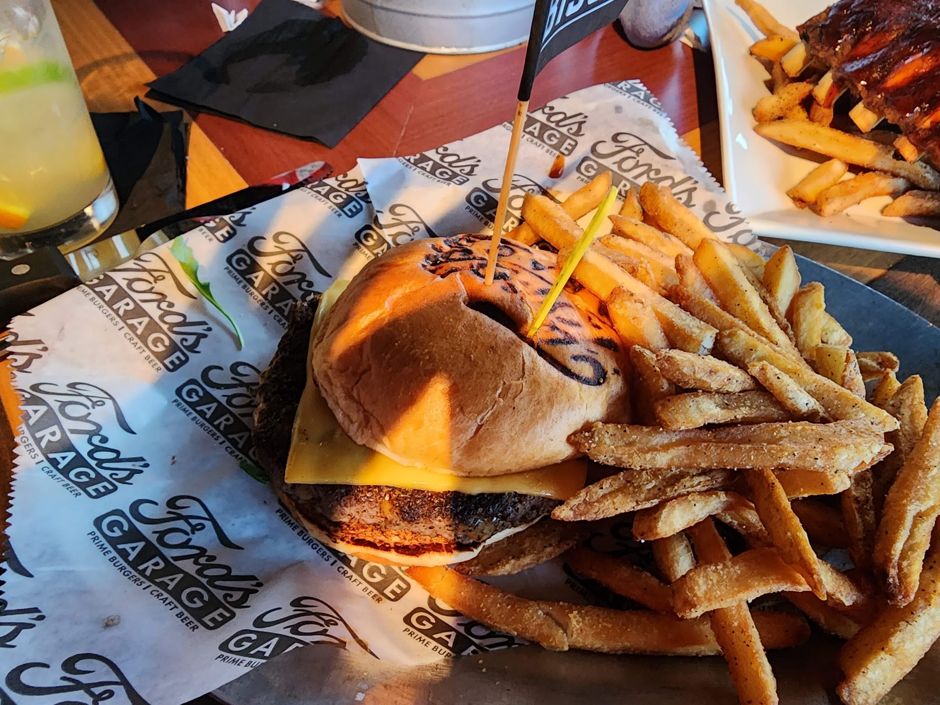 Now the food is primarily a burger and fries place and it is delicious, I ordered a mushroom and Swiss burger cooked medium with all toppings listed on the menu, the burger is cooked perfectly hot with slight amount of pink inside, perfectly seasoned, the seasoned french fries were perfect side to accompany the burger. Several other sides can be ordered in place of fries, with a small up charge for premium or extra sides. Food arrived quickly, and the waitress was very attentive, checking with us to see if we were interested in dessert, and at the time, we weren't sure, so she said she'd check again later. She did ask again when we were finishing up, we declined dessert, and she promised she'd not keep hounding us to buy dessert. She made sure drinks were refilled, my water and my friend's iced tea as needed. The cost for two meals was less than I expected as two people with 25% tip was a little over twenty dollars each. I was very impressed with all aspects of Ford's Garage from the approach outside into the building, the tables and chairs, and everything inside was very clean. When I went to wash my hands before eating the sink in the men's room took a minute to figure out as the water appears to come from the oil drum base and it has a petroleum nozzle affixed to the top. (Hint - there is a valve on the copper pipe on the wall leading to the oil 🛢) which I found to be a fun element to hand washing. If I was to have been with any kids, I would stress the importance of supervision. I know the 7-10 year old me would have been playing with the sink and probably would have made a mess with the water. I'd give the entire experience 5 stars as the level of service is way higher than we've come to expect now, and this made for a great day out in a...
