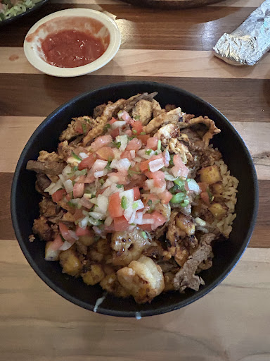I chose the Hawaiian Bowl. Seasoned steak, chicken, shrimp, pineapple and chorizo served over rice and whole beans with pico and cheese sauce.