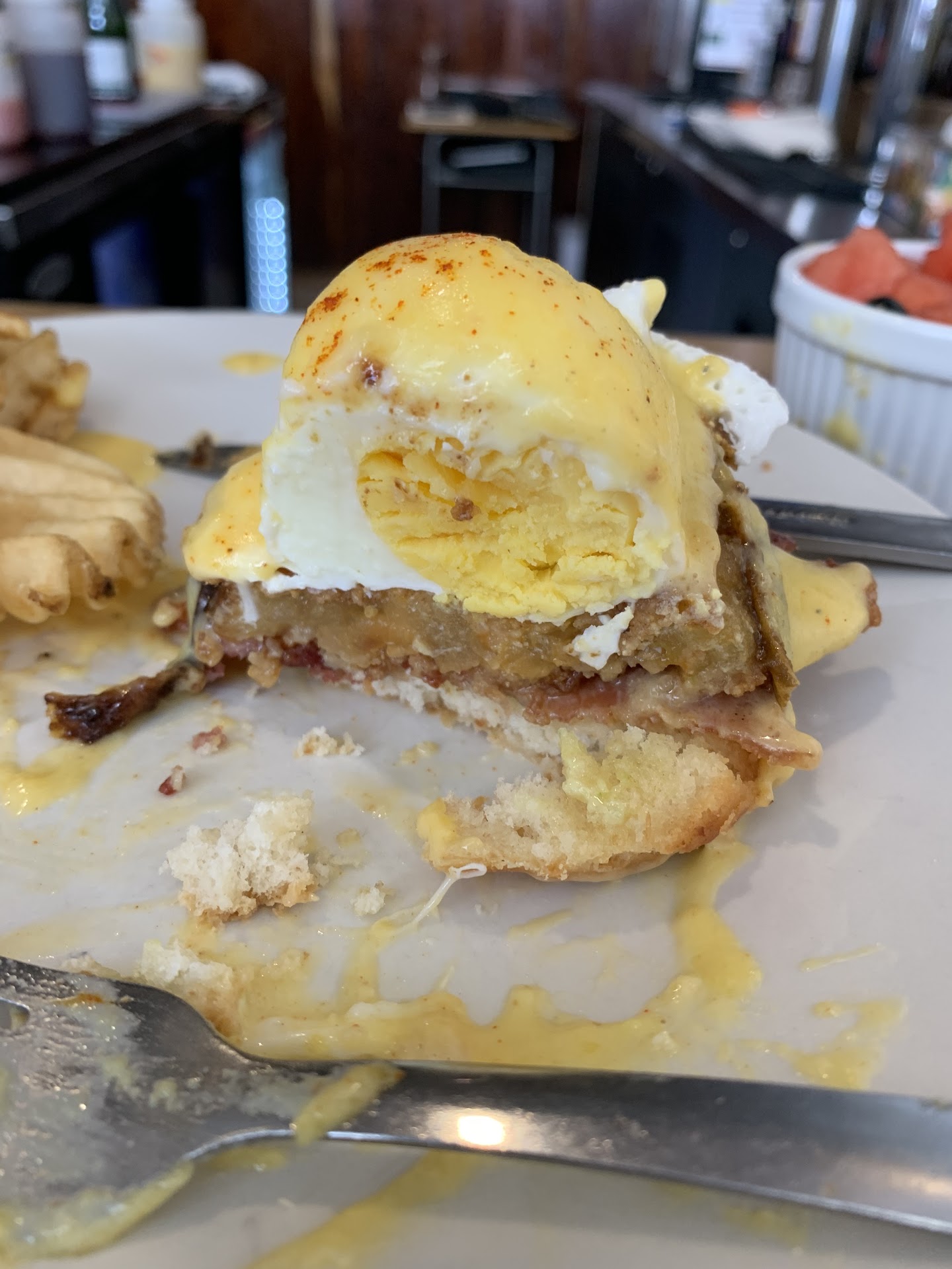 Visited today for brunch. Heard great things about the place and my wife and I decided to try it after church. We chose to sit at the bar since no tables Available. Seated at 12:10pm and order take for two eggs Benedict plates. At 1:13p.m our food was brought to us. Nothing in between except every other patron at the bar that sat well after we did for their food. Then as can be seen in the picture eggs Benedict are supposed to be runny yoke. Ours were both like hard boiled eggs and my side was of potatoes was out as they substituted without asking me. No apologies for the wait or Asked how the food was. Service was horrible and the meal was substantially below expectations or how a poached egg is supposed to be cooked. Each had two eggs over cooked. Sorry but paid a good price for meal that lacked and service that was subpar
