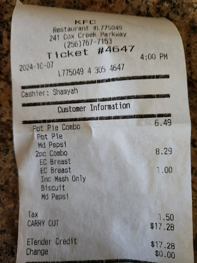 Read moreHorrible food. The popcorn chicken was way over cooked, the mashed potatoes tasted like chemicals and the cashier's can't even keep track of who's order is who's. They told us at the drive through $11 and some change but when we get to the window she says $16 and some change, then after fixing that error she says she can't give a receipt because the machine was "messed up," go to call and complain and have my order fixed since I can't get a refund because she didn't give a receipt and get no answer. Tried to called back to back and got nothing. Just like every other fast food restaurant in Florence just horrible. Corporate has...