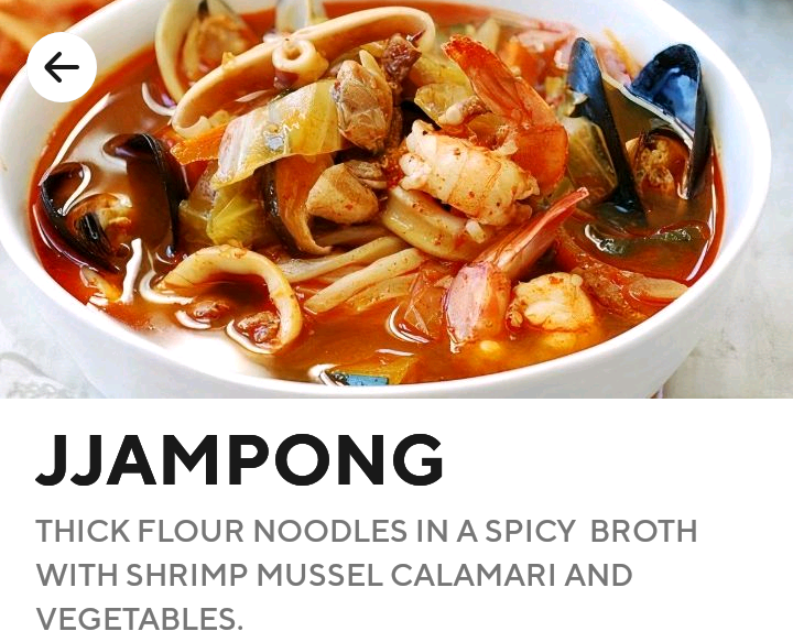 For the Jjampong (Thick flour noodles in a spicy broth with shrimp, mussels, calamari and vegetables) : Noodles were definitely not quite as described & definitely not the style pictured. Seemed like the noodles were just these, which I've used before and even then they didn't have that aftertaste: (images of menu picture vs noodles that I suspect were used attached below) tasted faintly like cardboard &/or old canola oil ( & that flavor also leached into the broth upon mixing) Broth tasted like it was basically just a slightly tangy, little salty something or other with a bit of bland and very mild hot sauce in it. With a hint of the flavor of the not so great seafood.Not much else in the way of flavor except what's mentioned above. (obviously wasn't expecting the seafood to be fresh in a landlocked state. But was still fairly disappointed.) Mussels were decent though. Shrimp & squid tasted kinda freezer burnt & were more rubbery than I'd expect. Vegetables were sparse and if there was any garlic involved I didn't see or taste any.