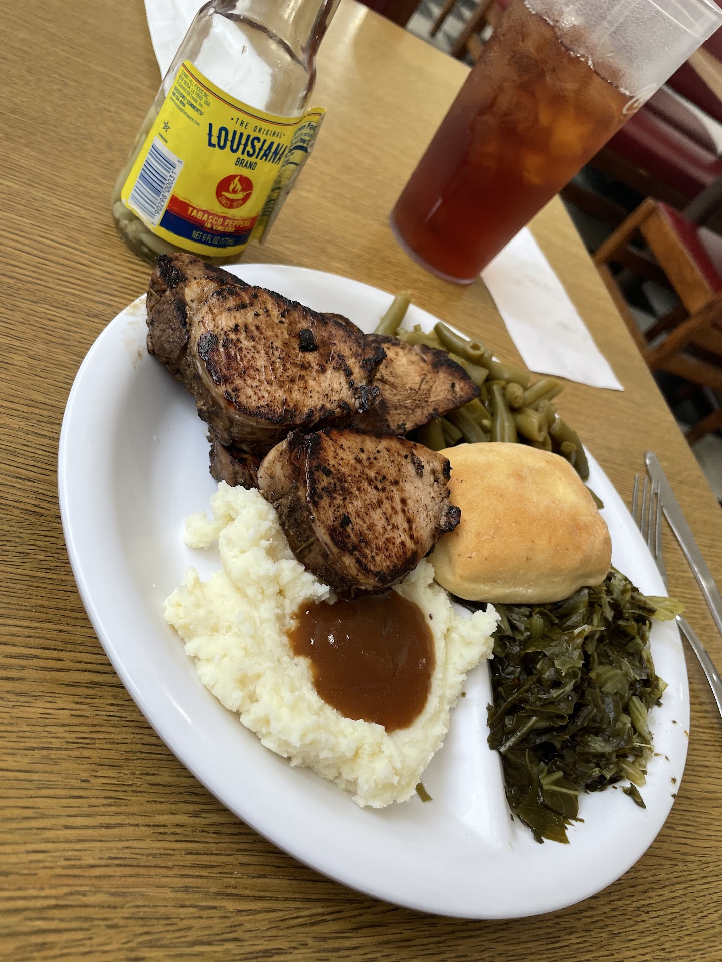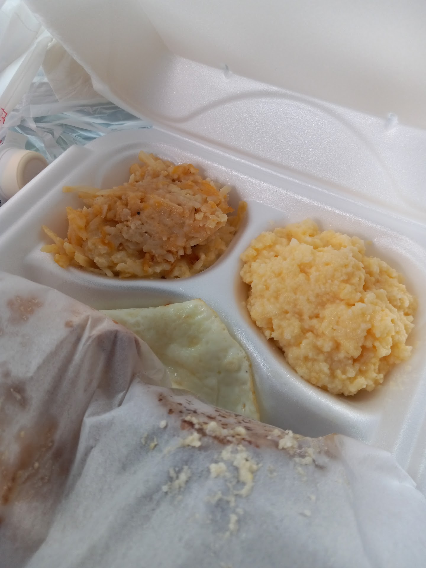 I had two overeasy eggs, sausage patties, biscuits and gravy, with sides of cheesy grits and hashbrown casserole. The cheesy grits and hashbrown casserole were especially EXCELLENT!! Washed it all down with some delicious cold sweet tea with lemon.