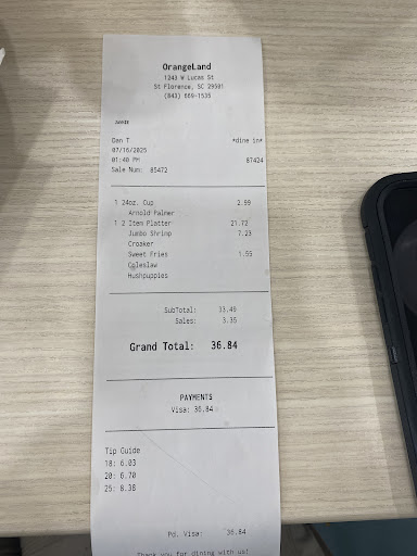 Read moreI give this 3 stars only because they are a seafood place with limited seafood. I wasn't particularly fond of the buffet it just didnt seem like a lot of options... At least when we went... We didn't see much... I was able to go to the back to check out fresh fish and seafood options... It was very small of choices... I guess they sell what they have... Or what the locals want and are use to... Since living in Florence I've been looking for stone crab and conch... And when I ask around they tell me Orangeland is the place to go... Well they never have it and can't even get it in... Tear drop... Then I have to settle. I must say the workers in the back is always helpful and friendly... Those guys work hard... As I was asking for the stone crab, having a complete meltdown because my recipe won't be the same for my guess coming in and telling him where I was from carried it and its further from Sc, they knew I was desperately in need but those slick buggers talked me into buying another kind of crab... I appreciate their kind words... When your really craving something ... You set your taste buds on it... Great customer service skills can make your customers feel at ease and they'd usually buy the next best thing if they are respectful... I purchased the next best thing... They also have seasonal blue crab I use to go get... I give this place 3 stars because the staff is so friendly & down to earth... I kept 2 stars because I can never get what I want because its...