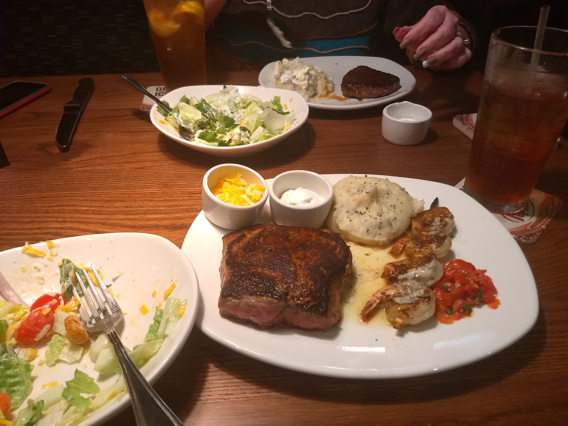 Heads up. Long post! HORRIBLE experience I’ve ever had in a restaurant. And no, I’m not one that says that without working in it. I’ve worked my fair share. First, we called ahead HOURS and got reservations in which we were told to get there a little early. We did. We waited an HOUR outside with 2 kids who were starving. Constantly being told that our table was being prepared. It takes an hour WITH reservations? Whatever we still went in giving it the benefit of the doubt. We come in and the first thing our mouthy waitress does is try to run us back out. Like literally just kept repeating that we probably wouldn’t get our food in the time we wanted and persistently drilled us. Again, we stayed. She takes our order being a little TOO loud if you ask me and then doesn’t return. Our food was brought by several different people and all at different times (they were ordered at the same time and we all had salads...) we FINALLY get our food and needless to say 2 of our steaks were RAW! My kids wanted ranch with their fries and they failed to let us know that it was spicy!!! Mind you I’m pregnant. Raw ANYTHING when ordered medium well is a NO NO! It was having a conversation with the other raw steak across the table 🙄 well I wanted mine redone. Needless to say they cooked it right the 2nd time but must have shaved his face while grilling it due to the hair in it. So she finally fixes me another plate to go.... thankfully the manager was very nice and made sure everything was taken care of. Our WAITRESS on the other hand was HORRIBLE! She did not refill drinks and walked past us multiple times! When we complained on her she quit coming back COMPLETELY and when a part of our group asked for the check she rolled her eyes and kept walking! She then proceeded to talk about our group to a whole other table saying how rude and how she couldn’t deal with us... like we didn’t even cause a scene? We were very polite until you start being childish. For what we paid to have a nice meal with friends and family we expect our service to be pretty decent. I will not EVER be back. My kids didn’t even wanna finish their food. My 4 year old was ready to tear into someone about her ranch 😂 yall it was just a bad experience...