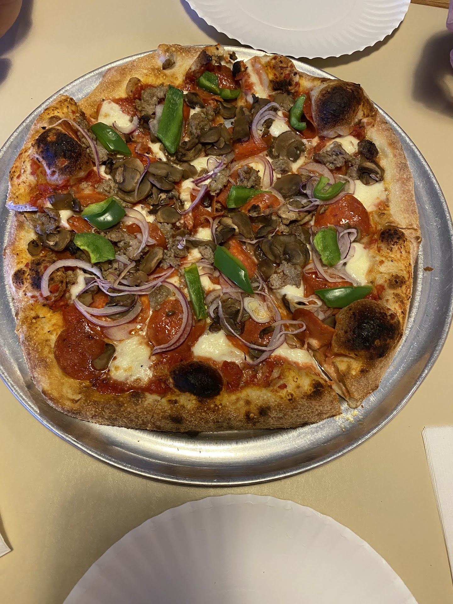 Read moreThe three stars is because everyone was nice, the place was clean, the the crust recipe was good had it been cooked correctly. Maybe we are just not use to it, not from the area, but we have never been served on paper plates, with plastic silverware, unless it's at a cookout somewhere. But, fine, it is what it is. First, we ordered a shrimp appetizer that was suppose to have blue cheese and bacon on jumbo shrimp. As you can see, they were not jumbo shrimp, there was no blue cheese, and two tiny pieces of bacon crumble. The shrimp were very dry and not seasoned. Then, the pizza we ordered (pictured), was overcooked on the top, but the crust was not browned on the bottom at all...which happens first in a brick oven. In fact, it was so soggy there was juice from the sauce puddled under the pizza. Three things cause this....sauce out of a jar, too much water in the sauce, and undercooked. We would...