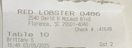 Read moreWe live out of town and have no Red Lobster in our town so we decided to have a late lunch early dinner while in Florence at this location. We have been to this location before and enjoyed it. We arrived a little after 3:30 in the afternoon. The store was not busy and had a few tables. A young lady came out and said someone will be will you shortly. Brittany came out and seated us, gave us our menus and asked if we would like anything from the bar. We declined the offer and she took our drink orders of a sweet tea and diet Coke. She told us she would be back with some biscuits and to please take a look at the appetizers on the menu to see if would like to start with any of those. Upon returning with our drinks she asked if we were ready and as always we were not and she told us to take our time. The menu had a large selection and almost all had excellent photos of the food. The colors and presentation of the photos were very well presented. I say this for a reason. Our server returned with the signature biscuits and WOW is all I can say. The biscuits were hot fresh and soft. I pulled one apart and the cheese was still melting creating a web of cheddar strands across my plate. I have never received biscuits this fresh at any Red Lobster.