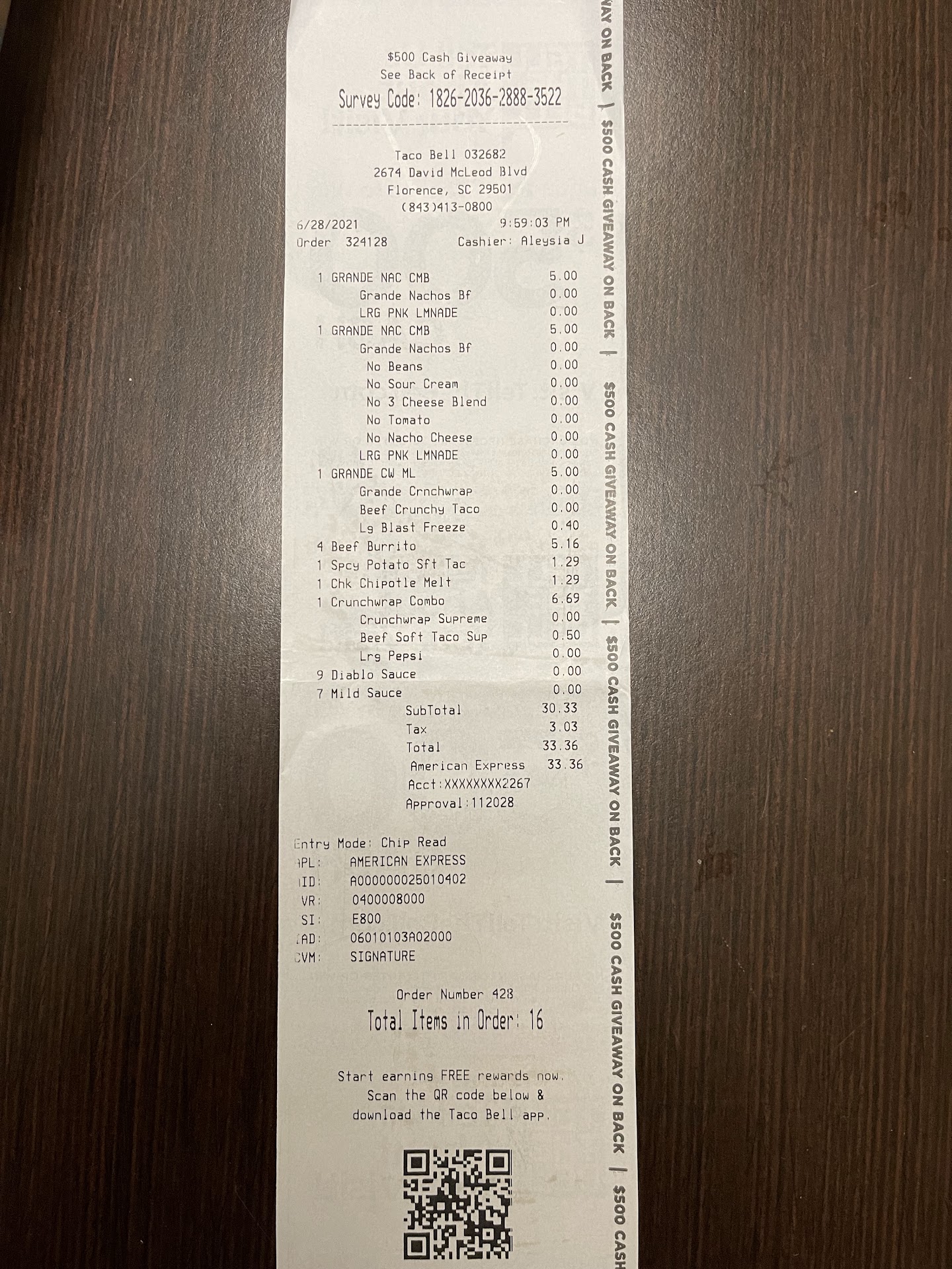 I do not recommend coming to this Taco Bell. You will be disrespected and ignored. This is a very poorly maintained staff and restaurant. The food was semi correct and cold. We dined in. We waited 10 minutes and no one said a word to us. We took the hint to use the kiosk and put our order in. At no point before the order was completed did a worker let us know that there were items in our order they didn't have (cinnamon twists). We found out from a couple ahead of us, who received nachos instead. We asked if it was possible to substitute the Cinnabon bites in their place. The worker had an attitude as we asked but said that was fine. We got our order, which we had put modifications on when ordered. The tacos were not correct. There were supposed to be 3 supreme tacos without cheese and tomatoes. One taco came supreme with cheese and the other two were just beef and cheese. I took them back up and explained they were wrong and how they should of been made. The lady that stepped up to re-address what was wrong told me that they were made to order and when I said that they weren't, she turned back to the kitchen and told another person to remake them. As she started to assemble another order while I stood at the counter to watch my food being made, she continued to talk about me just loud enough for me to hear but not make out the words. These workers all had attitude and were rude, did not want to do their jobs, and had not one ounce of respect for their customers. The restaurant was not clean either. We will not be back to this establishment. The only reason I gave it one star is because you cannot give half a star or less. I may not go back to Taco Bell at...