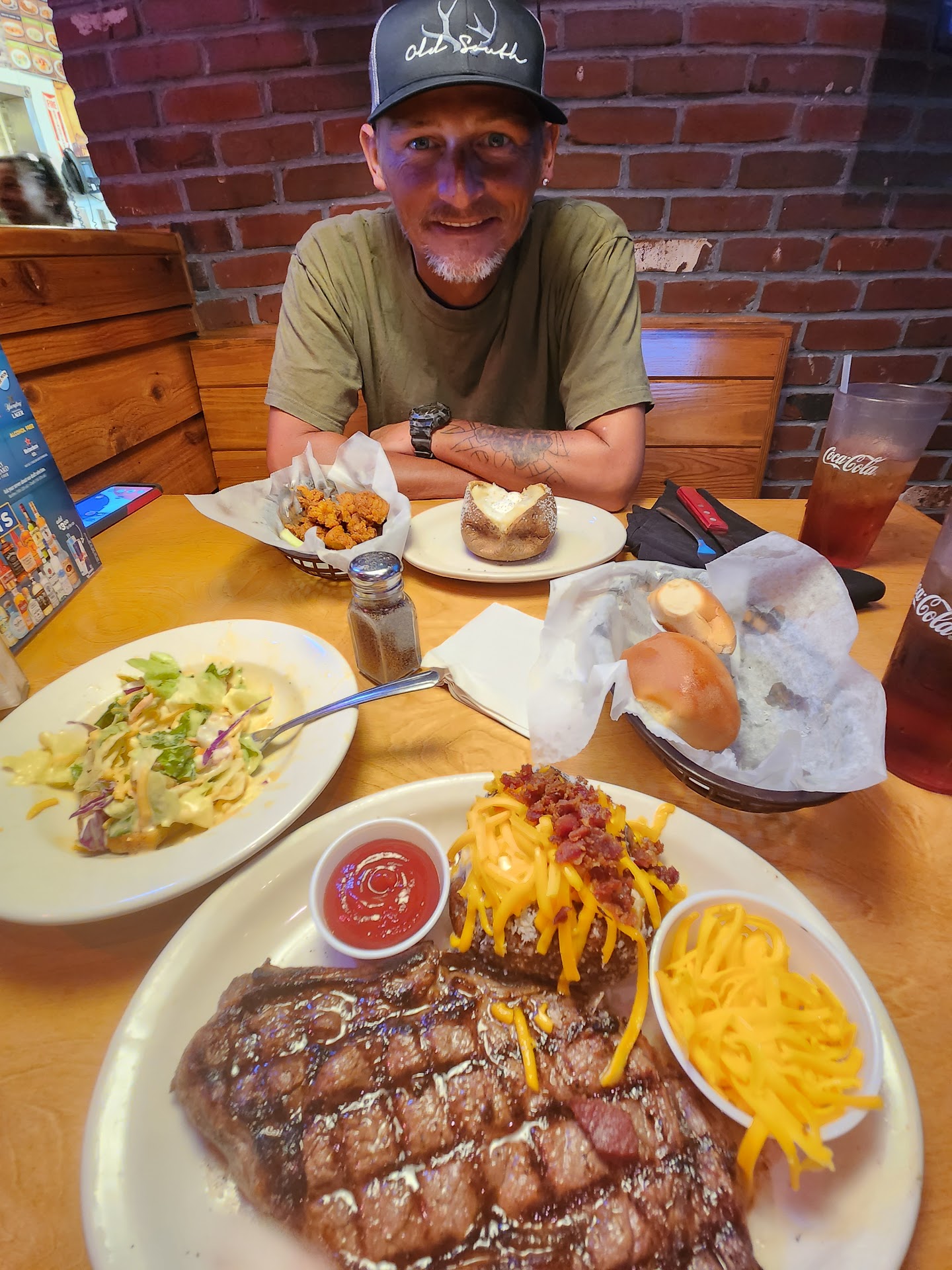 When I received my order—a country plate with corn, loaded baked potato, fries, a loaded sweet potato, and sidekick ribs—I noticed that I had been given steamed vegetables instead of the baked potato, and the ribs were hard on the bottom. Josh gladly took the plate back and brought me the loaded baked potato I originally asked for. From there, our visit continued without incident, and we enjoyed our food and drinks.