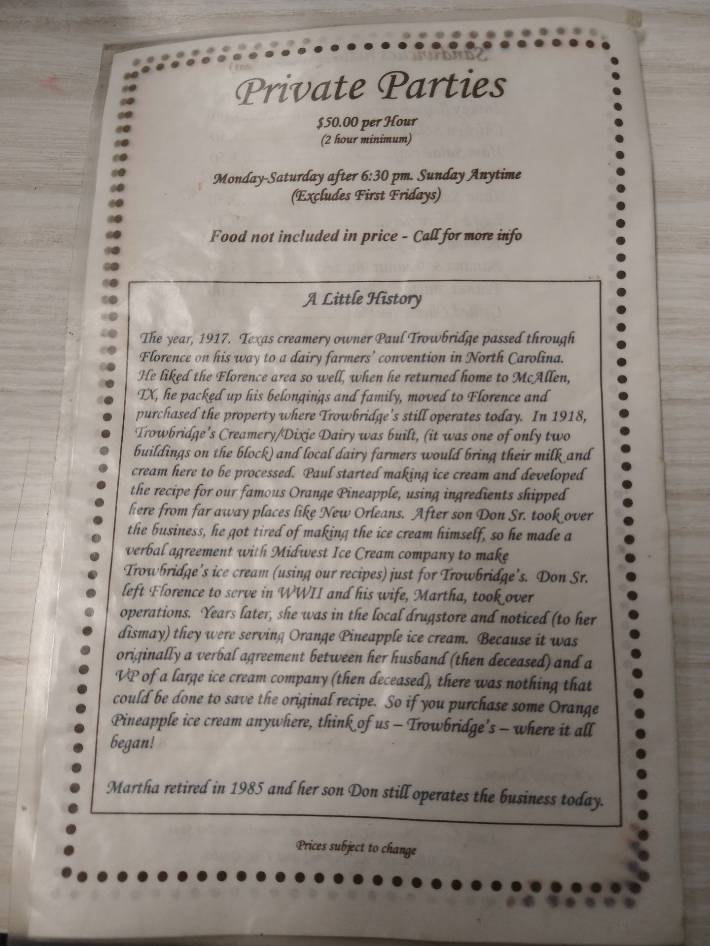 Read moreWhen I was growing up, my Mother took her kids to Trowbridge just about every Friday. She loved doing this. We would have chili dogs, potato chips, Cokes and for dessert, orange pineapple in a stainless dish with a paper insert for the ice cream. Being a child just a few years old, I thought it was something because the ice cream server was almost as tall as I was. Bahahaha. I will always remember that as being one of my fav childhood memories. Mama and her three girls. I miss her so much. Every time i drive by Trowbridge or go there to eat, I think of her and it brings tears to my eyes. That is exactly why I love Trowbridge,...
