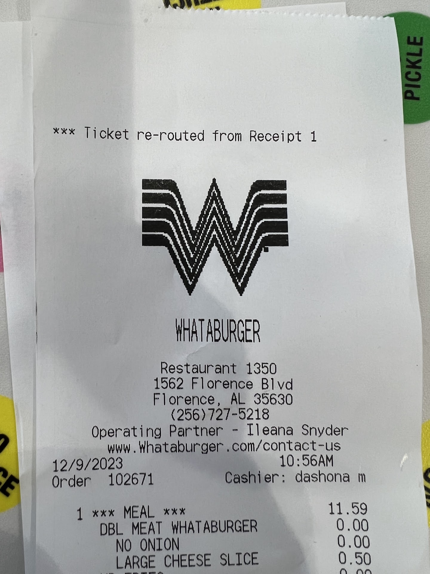 Read moreI understand that this restaurant will have longer wait times as they are newer, but it makes no sense to open both lanes if you are not going to serve them both. Today I waited for an hour in line, and the first 30 minutes I was gracious because they were very busy. I lost my patience, however, when myself and the two cars in front of me were receiving no service as car after car was getting their food and leaving. I sat with two cars in front of me in the second lane for 20 minutes and watched the cars that got there after me clear out from the first lane. At one point the first lane was completely empty and anyone that pulled up would order, get to the window, and within ten minutes they were gone. It took the first car in the second lane getting the attention of the person taking orders in the second lane to finally get their food out. After this, the car directly in front of me received their food as well. They did, however, skip my car and bring the car BEHIND me their food first which upset me as well, but they quickly brought mine out afterwards. I ate some fries immediately after receiving my bags and they were cold. I also ate my burger and noticed something black and nasty on one of the first pieces that fell off of my burger and there was no mustard on my burger. They forgot the sauce I asked for but did not forget to charge me for it. I am hoping that this was just a fluke and that further measures will be taken in the future to prevent this sort of thing. I really enjoy whataburger, but this experience made me wary to try the Florence...