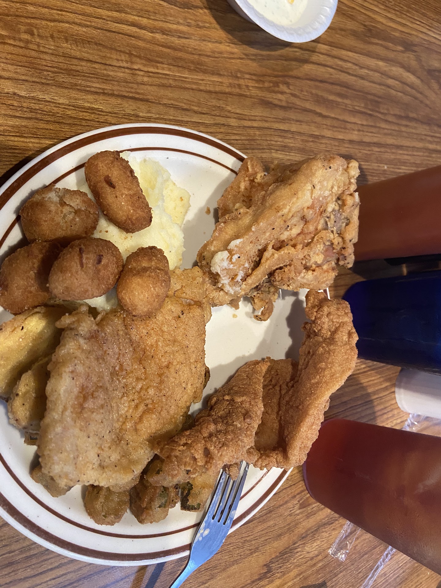 Read moreThe food at this establishment is good. However, it is not consistently so. We have come in the evenings on Friday and Saturday nights and had good Fish, chicken or ribs. And other nights it’s barely edible. Somethings are consistently bad, like the biscuits. They sort of resemble small white hockey pucks instead of nice high, fluffy, southern biscuits. Over the last couple of months, I feel the salad portion of the bar has been scaled back to accommodate more carb options, which they definitely don’t need more of. We went for the Sunday brunch today and the first pan of macaroni and cheese which my daughter got was excellent, and 15 minutes later, when a new pan was placed, I grabbed some and the noodles were so over cooked, It was like weird greasy congealed cheese mush. The devil crabs today were pickled flavored stuffing in a crab shell without any actual crab meat. The fried pork chops are always wonderful and the nondescript fried fish was fairly good as well. The hush puppies were stone cold, which maybe that’s just a regional thing, but I’m used to them being served hot.