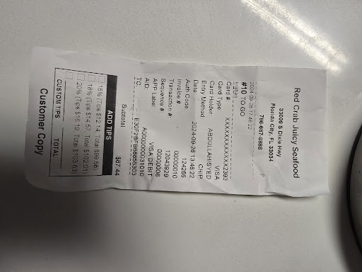I highly, highly recommend Red Crab in Florida City. The food is fantastic, the vibe is great, and the service is absolutely top-notch. I will definitely be coming back soon. Thank you for such a wonderful...