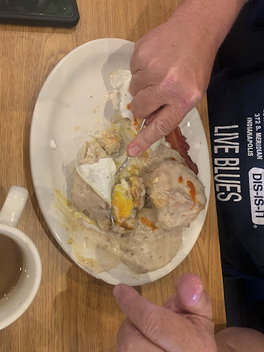 Our waitress was friendly and courteous but the food was pretty bad overall. My husband got the fried green tomatoes for an appetizer and enjoyed them. He got the biscuits and gravy with over medium eggs while I got the southern breakfast with over medium eggs. Both our meals biscuits were very hard and inedible. He managed to eat his eggs and bacon but said they weren't very good, I'm pickier than him and wasn't able to eat my eggs at all. The bacon was OK. My country potatoes were fantastic though, I ate them all before I took a picture of my food, lol. The waitress did discount our bill due to not eating most of our meals but I don't think we will be trying this place again. Another table before us also had issues with their biscuits being too hard but still the kitchen served us the same hard biscuits (we thought the kitchen would fix the issue for our order since the other table got new good biscuits after talking to the waitress). EDITED TO ADD: we both experienced severe bowel discomfort within a couple hours of...