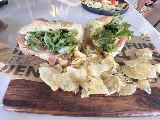 Forcing myself to move on from Number 70 (oh, how I love thee), I greedily grabbed Number 91 and, without ceremony, began chowing down. Number 91 was lovingly stuffed with Serrano ham, mozzarella, fresh tomato, arugula and made on-site pesto sauce. Serrano is regularly applied to all dry-cured ham products in Spain instead of jamon de York, which is cooked whole on the bone. Needless to say, this was as spectacular as Number 70. That bread, though!! I am confident they don't dry-cure the hog in the back, but Holy Porky Pig, this was phenomenal.