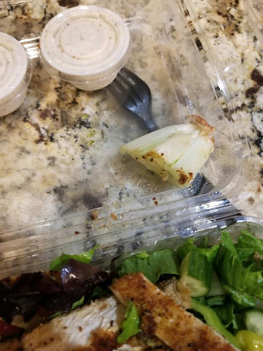 The food quality at Acropolis is great, but it is pretty much a gamble as to whether my Athenian chicken salad will have the right ingredients. I have had probably 5 different combinations of the salad - sometimes no pesto, sometimes with pesto; sometimes without pita strips; sometimes without tomatoes; sometimes with green peppers; sometimes without the feta as requested; sometimes a lot of lettuce, other times I've stopped at Publix to get more lettuce on the way home to add to my salad. This most recent visit, I received the butt of a stalk of romaine in my salad (picture attached).