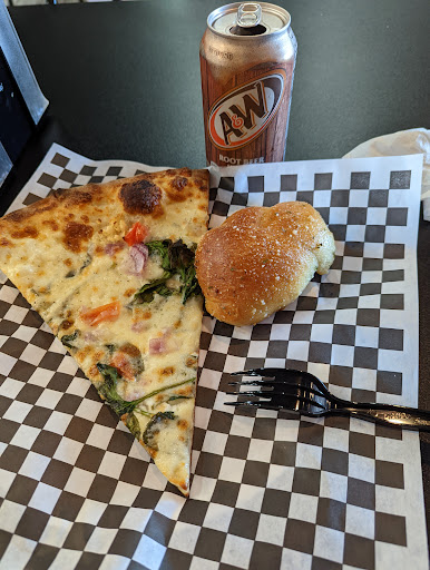 Popped in for a late lunch at the "NEW" pizza place across the street from us. They had several pies to choose from for their "slice for $4". I chose a MOST delicious piece with tomatoes, red onions, spinach, and garlic, and I added a single garlic knot, and an A&W Root Beer, all for $8+change.