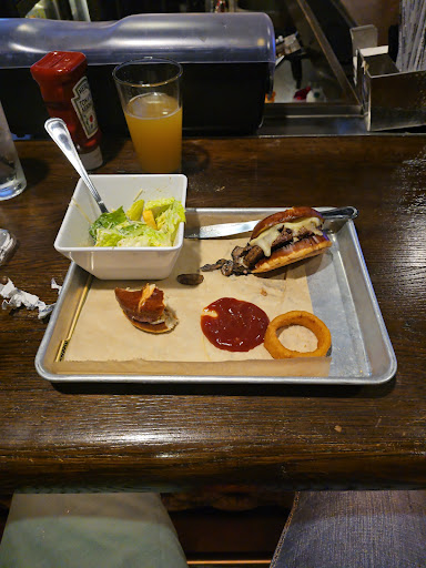 Read moreFood: Alice&Pete's Burger w/o mushrooms - came with mushrooms. Absolutely no seasoning on the burger. More than likely a frozen patty, cooked to order. Ordered medium in temp, came out well. Its like chewing on cardboard. The onion rings are good. Salad was good.
