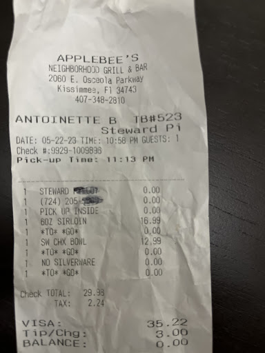 Read moreI order 2 for 2. Caesar salad and bacon cheeseburger. My son ordered too. At some point when I was eating my last big green leaf of my salad, the truth was uncovered. I saw in the remaining of the little portion of salad left in the plate, this repulsive, gewy, looking brown blob form, piece of food with too hard sticks coming out of it 🤢. I separated the 2 sticks apart nastly investigating feeling. The second thought 🤔 nasty dirty kitchen counters and ?????. My son had stain outside of the plate 🤢 and the bottom outside has cheese. The manager Manny Rivas explained that he was in the back of the kitchen area cleaning dishes and helping with other tasks, because he is short staff, that he is unknown to the kitchen's cleanliness and food handling. Wow Manny, but you just told me you are in the kitchen doing tasks, because you are short staff. When I also show the raw looking bacon, he was quite, and did not comment about that. The manager is the same as the employees, and the employee does what is allowed to do when the manager is not doing his job. My son that order too has a health condition sickle cell anemia, with a weak immune system. Think about that next time you allow nastiness in the restaurant; Manny and Applebee's. I am not going back to this restaurant because they do not care about others people health. The excuse is I DIDNT SEE I WAS BUSY BACK THERE IN THE KITCHEN HELPING. Manager Manny change your excuses for humane...