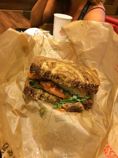 This picture feature's my friends vegan sandwich. This cross section shows all the vegetables and potato-cake that was substituted for the typical meat in the sandwich. So innovative and consumer friendly.