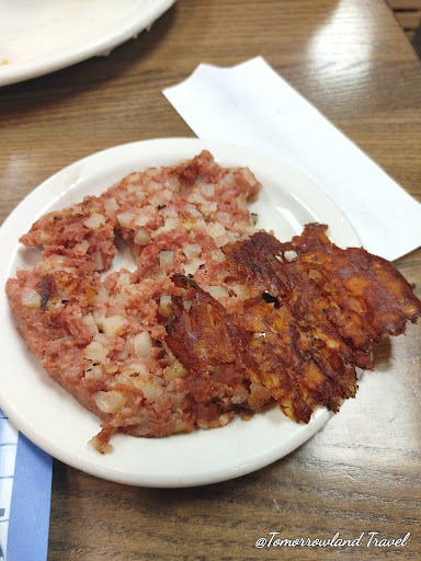 I was delighted with the eggs, as they did come out over medium, which is a great flavor amplifier for hearty savory flavors. The eggs weren't oily either, which was a departure from most diners who griddle then steam their eggs under a hat. The potatoes looked cut in-house, but were mushy and not what I would call home-fries. There was no browning at all to them from a griddle or fryer. They were just a collection of unseasoned and bland roasted potatoes. The sausage was not flavorful at all, the bacon didn't add anything to the dish, the ham was just recognizable as ham from the color and cubes that are recognizable from frozen bags. The peppers and onions also tasted bland and unseasoned as if they were just from a frozen bag. The jack cheese didn't really have any kick to it, and was just used to glue everything together. All in all, the skillet was unimaginative, bland, and overall just filling. I was wondering if I might be coming down with covid and I was getting a lack of taste, but I could easily still taste the less than spectacular coffee, so I know it was not just me.