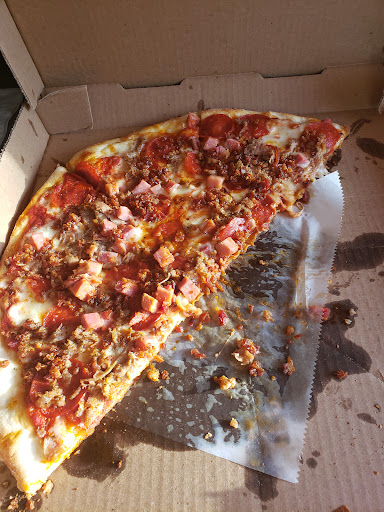 Another 25-30 min goes by and it comes back out. This time with maybe 10 pieces of pepperoni on it and less than a handful of ham chunks.