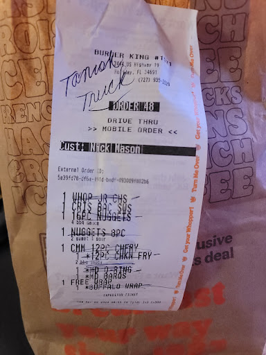 Read moreMy husband and I visited this Burger King location at US Highway 19 and Moog Road in Holiday, Florida after renovations. To our absolute astonishment, we had the very best experience you could have at a fast food restaurant. The young lady that took our order couldn’t have been more pleasant, informative, patient and accommodating. She was wearing her hair up in a big bun, like I always do. We were talking about where to go to find a place to swim her, and her fiancé are always looking for somewhere to go. The bread was fresh. The meat was not over, cooked and burnt like I usually get from burger kings especially the one at Tarpon Avenue in US Highway 19. They were the juniors they had specials going on. We had one coupon for two and then they had another special. They were perfect for what we needed to take home by the pool. I had mentioned to my husband I had to use the ladies room. I started walking around to the area where it was and another young lady greeted me and said I heard you need to use the ladies room walked me there, unlock the door and open the door for me And she couldn’t have been more pleasant with the best smile. The place was so immaculately, clean and organized. I didn’t even recognize this as being a Burger King as a fast food restaurant usually is. I would give this place a 10 star if they had availability it starts from the top so the managers are obviously hands-on and treating their staff impeccably because it shows in the way the staff is treating the customers my husband and I have been involved in hospitality, our entire life and we’re completely blown away by this. I will recommend this location and this location only and we will be returning , thank you very much for a very pleasant and surprising experience. You guys are the absolute best the entire staff. Thank you very much from Keith and Denise locals to Holiday...