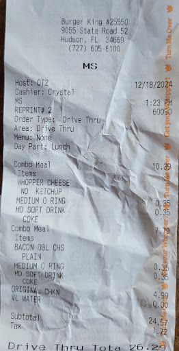 Ā Ā Ā Read moreHey everyone at your Burger King spot! I've got some awesome news! This BK is just as fantastic as the one on US 19. Customers can dive into those delicious flame-grilled burgers for both lunch and dinner. And for those early risers, you can snag any of BK's breakfast goodies, like the Croissan'wich (if it's on the menu). Now, for the not-so-great news! On March 7, 2025, my mom drove me through your drive-thru in her red car, and she ordered two bacon cheeseburgers, some chicken nuggets, fries, and a medium sweet iced tea. But guess what? I ended up with two double cheeseburgers instead of the bacon ones. I did get the chicken nuggets, fries, and iced tea, though! While I was enjoying my lunch at my apartment instead of in the car or at your BK, I discovered an onion ring in my takeout bag. I decided to munch on it alongside my meal. It seems one of your team members accidentally tossed in that onion ring, and I just went with it. Sorry about the mix-up! But wait, there's more! On April 2, 2025, the day after the great prank day, my mom treated me to a feast fit for a king: two bacon cheeseburgers, a petite pile of french fries, some Mozzarella Fries, marinara sauce, and a refreshing cup of Burger King's sweet iced tea. Naturally, I had to dive into those Mozzarella Fries with marinara, and let me tell you, they were as heavenly as the flame-grilled bacon cheeseburgers, the small fries, and that sweet iced tea. It seems one of your team members might have pulled a little prank by tossing those Mozzarella Fries and marinara sauce into the bag, thinking it was still April Fools' Day when my mom swung by the drive-thru....
