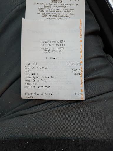 Read moreHey everyone at your Burger King spot! I've got some awesome news! This BK is just as fantastic as the one on US 19. Customers can dive into those delicious flame-grilled burgers for both lunch and dinner. And for those early risers, you can snag any of BK's breakfast goodies, like the Croissan'wich (if it's on the menu). Now, for the not-so-great news! On March 7, 2025, my mom drove me through your drive-thru in her red car, and she ordered two bacon cheeseburgers, some chicken nuggets, fries, and a medium sweet iced tea. But guess what? I ended up with two double cheeseburgers instead of the bacon ones. I did get the chicken nuggets, fries, and iced tea, though! While I was enjoying my lunch at my apartment instead of in the car or at your BK, I discovered an onion ring in my takeout bag. I decided to munch on it alongside my meal. It seems one of your team members accidentally tossed in that onion ring, and I just went with it. Sorry about the mix-up! But wait, there's more! On April 2, 2025, the day after the great prank day, my mom treated me to a feast fit for a king: two bacon cheeseburgers, a petite pile of french fries, some Mozzarella Fries, marinara sauce, and a refreshing cup of Burger King's sweet iced tea. Naturally, I had to dive into those Mozzarella Fries with marinara, and let me tell you, they were as heavenly as the flame-grilled bacon cheeseburgers, the small fries, and that sweet iced tea. It seems one of your team members might have pulled a little prank by tossing those Mozzarella Fries and marinara sauce into the bag, thinking it was still April Fools' Day when my mom swung by the drive-thru....