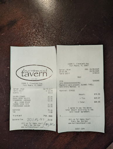 Read moreI wanted to go to a decent dinner while I was in town visiting my girlfriend. Ratings of the Burntwood Tavern looked good, so we thought to give it a try. We were sat in the dining room after walking in without reservations. No waters were brought out. We noticed a party of 15+ celebrating a birthday nearby. We both ordered drinks, lobster bisque. Drinks and lobster bisque eventually came out after about 10-15mins. Drinks were okay but the lobster bisque was too thick compared to any other bisque I had before. It was closer to a consistency of cheese sauce. Possibly pre prepped, then warmed incorrectly. I ordered fish and chips, my girlfriend ordered the Grilled California Chicken Sandwich. Fish and chips came out soggy, breading was falling away from the fish. The Fish and chips was also a fully fried filet instead of strips/smaller filets. Coleslaw on the side only tasted of horseradish. Fries were cold. The grilled California sandwich was mediocre at best. Got another round of drinks and a key lime pie then asked for the bill. Bill total on the bill read 106 dollars, I put my card down then the card and bill were taken away. A 599 dollar receipt showing my card number was ran showed back up at the table with my card in one side of the leather billfold and the original bill of 106 dollars on the other side. When brought to the attention of manager, Scott, he stated "these things happen" and did not void the bill but edited the amount which left the charge pending on my account for 4 days before reflecting the 106 dollar charge. When i asked for proof that the amount would change or a copy of a voided 599 dollar bill, Scott (the manager) said it wasnt possible. This could have been resolved with voiding the check and creating a new one. Scott didn't apologize until I asked him point blank that he charged me for someone else's bill then didn't void it. Kinda felt like I was left in the dark with an almost 600 dollar charge in my account with no explanation or sincere apology. Overall the experience left a nasty taste in my mouth in a couple...
