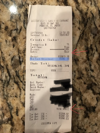 Upon asking the gentleman (who I presume is the owner) why I was charged a “non cash adjustment fee” his response was everything but satisfying. After moving a bunch of papers out of the way he should me a sign taped to the counter saying “credit cards will pay a 3.5% fee.” Keep in mind this wasn’t visible until I asked him about it and he moved the papers. Also I did not pay with credit, I paid with debit which makes a difference.
