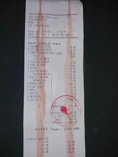 Read moreThe seafood at Cayo Esquivel is exceptionally presented and is, of course, delicious! My only complaint would be one of the servers, named Eugenia. Every other server that has served us there has done so quite graciously. On one occasion, however, we went to Cayo Esquivel and were served by Eugenia. Before the appetizers could make it to us, however, she asked us if we would move to another table, as some guests were with an uneasy child, and they wanted a smaller booth to contain her. We agreed, and moved to another booth. However, immediately after we took our seats in the new booth, we looked over at the one that we were in, and there was no child there at all. As it turned out, Eugenia had lied to us in order to seat that party where we were, which is where they wanted to sit. We were in plain view of them, and she still proceeded with her audacious action.