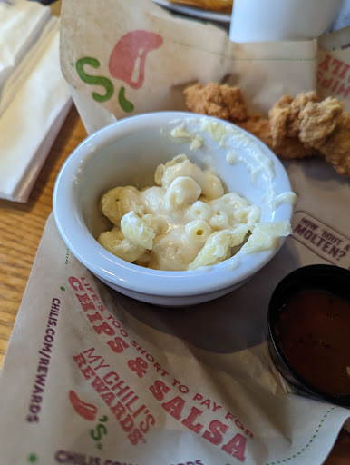 Ā Ā Ā Read moreI usually do not give bad reviews but cmon...look at this dish of Mac n cheese. I usually visit the Stuart Chili's and tonight I decided to go right next door literally to my store and get dinner and a glass of wine after working a 10 1/2 hour shift. When they brought my food out this is what the Mac n cheese looked like...(half eaten). I said something to the possibly shift manager and he made an excuse this is what it looks like! All the other probably overcook it. That was not my problem! The problem was its half eaten with only 4 noodles in the bowl. He brought me 2 sets up silverware (waste) toppings I did not ask for and I'm sure they are going to charge me for them! I will never come over here for convenience again. I will go to the one in Stuart from now on. Oh by the way I brag about the Mac n Cheese from here. I will not recommend to my customers again!