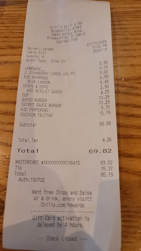 My wife and I have been going to Chilli's for years and we generally eat the same thing each time we go. Today we went to the Chilli's in Brooksville and were disappointed pretty much all the way around. There was a gentleman with his two very young daughters in front of us when we walked in the door waiting fo be seated. The hostess showed up after a few minutes and tried to seat the gentleman and his daughters at a booth in the bar where the booth was about four feet from the floor. The man declined and she sat him at a regular booth. The hostess then tried to sit us at the high booth in the bar and we declined. She then tried to sit us right outside of the bathrooms across from a workstation where we briefly sat and after she left, reseated ourselves. There were plenty of seats away from the bathroom and noisy workstation. The next issue was the menu. They gave us a plastic sheet that instructed us to scan a barcode to see the menu on our phone. My wife doesn't carry her cell phone with her and I wasn't about to try and read a menu on a cell phone. Our waiter, Fabian (the only good experience at that Chilli's), was nice enough to dig up a regular menu for us. Now for the meal. My wife had the buffalo chicken salad and a bowl of the chicken enchilada soup and I had the bottomless soup and salad with chips and salsa. My wife had decaf coffee and a water and I ordered sweet tea to drink. For some reason (and a lot of restaurants are doing this now days) the waiter/waitress takes your order and someone else brings your stuff. We placed our order and Fabian was meticulous in getting all the details of our order. After ten minutes or so a young girl came out with my wife's coffee and soup. My wife had finished her soup when that same young gal came around again and I asked her to bring my tea and my wife's water. A few minutes after that I asked Fabian to bring out the chips and salsa and he brought that and my soup. As I said earlier, my wife and I have had this particular meal many times in the past. The potato soup was really lacking in potatoes and mostly cheesy broth. The lettuce used in the salads was far from fresh. Some of the chicken in my wife's salad was not completely done. All in all, with the exception of Fabian, it was a very disappointing meal. I will not return to that...