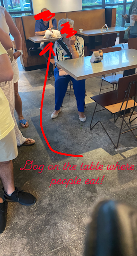 A customer had his dog on the table and staff didn't tell the gentleman to remove his dog from the table WHERE PEOPLE EAT!