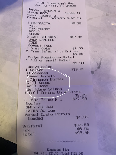 Our friends invited us to have dinner at Cody‘s steakhouse and I am very glad they did. We were lucky enough to get a server by the name of Ken. I would have to say he was by far, out of every restaurant I have ever been to, the best waiter we have ever had! From the very beginning, he welcomed us with a smile, a great attitude, and a funny joke. He has A wonderful personality he continued to make us laugh and feel like we were part of the family. Our drinks were never empty. He came by and checked on us very often and the jokes continued to keep coming, and of course, we joked back with him. He was extremely funny and when we go back to Cody‘s, we will request him as our server. He went over the list of specials and told us since we arrived during early bird Special that was the same amount of food, as was the regular portions, but it was cheaper. He was very helpful, very knowledgeable, and treated us like he knew us forever. As you can tell, I’m talking more about our server, Ken, than I am the restaurant. The reason for that is like I said, he was the absolute best waiter we have ever had, and we dine out a lot. Now onto the restaurant. Everything was extremely clean. The service was fast the amount of food we were given was very good for the price that we paid. The French onion soup was probably the best that I’ve had in a long long time. The raspberry iced tea was excellent and didn’t taste like anything artificial had been mixed with it. Our food was brought to us rapidly and looked like an artist had created each dish with skillful hands. There was plenty of parking, handicap accessible, a wide variety of dishes that you could select from. The bathrooms were very clean, handicap accessible as well. We are very, very happy that we chose to come to Cody‘s and I hope the pictures I submit do it justice. And I even got a picture of Ken. The best waiter of the year award goes to him. Unfortunately, I don’t see a place to post my pictures so they will be...