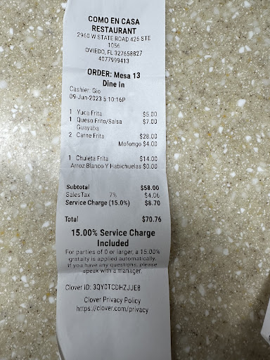Read moreI heard about Como en Casa from a Columbian friend. My son lived in Aloma Woods a few years ago and if this was there I was missing out! I even went into the smoke shop next door a few times. In any case the day my friend told me about the restaurant my wife and I went to dinner here. Lots of food and man the prices are good. I had the pork chunks and she had the pork chops. It was so much food that my wife basically brought home her pork chops. Her pork chops were excellent. My pork chunks were slightly overcooked but still tender on the inside with a crunchy outer layer. Still worth 5 stars.