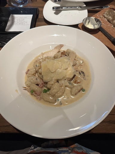 Read moreArrival The atmosphere in this place is awesome. The entry with the wine displays and tasting bar is top rated. Service. Shawn our server was knowledgeable and very helpful with menu suggestions and the recommended wine pairings on the menu is a brilliant touch of marketing not to mention the complimentary tastings. There is definitely no rushing you out the door here which is a treat in an upscale chain that is usually looking at turning tables. Wine The wine is above average for the price. We tasted a Cabernet Sauvignon, a Super Tuscan and a Chardonnay. All were smooth and tasty with no bite which generally accompany some restaurant private labels. Food This is where the train went off the rails. We ordered the sweet chili calamari and the egg rolls. Once again, Shawn did an excellent job explaining the dish, the sauces and getting our feedback before placing the order. Not sure who’s running expo in the kitchen but they need a remedial course in calling orders. The calamari came out first. It was very tasty but was warm at best and had been sitting for a while waiting for delivery. The egg rolls arrived hot and delicious. My biggest disappointment was with the surf and turf. While I like the idea of being able to choose various options my beef medallions and drunken shrimp were less than stellar. At $45, the beef medallions were very small and must have been cut from the tail of the tenderloin. We asked for medium rare and if they had been a decent thickness and hadn’t been placed under a heat lamp for an extended period of time they may have arrived at the appropriate doneness. The veg medley side had obviously been prepared in a batch had scooped from a hot table. I ordered a side of fries which did not come with the order. I told the runner who delivered my dish and she apologized and went back to the kitchen. Several minutes later when our server came to check on us , I also told him I was waiting on my fries and he too apologized and went to the kitchen but the fries never arrived. Did I need an order of fries? Absolutely not. My waistline was thankful they didn’t arrive but here I am 12 hours later still thinking about them. Will we give them another try. Sure. I’ve been in the business and every kitchen doing volume in this category can have an off night. Final note. Go for the service and ambiance, lower your expectations on the food. BTW. I brought one of the medallions home for a measure. It was 2 x 2 x 1/2. Granted this is a cooked measurement which means it probably started out at just under 3/4 of an inch. Professionals knows how difficult it is to get a sear on a steak under 1” and return a medium...