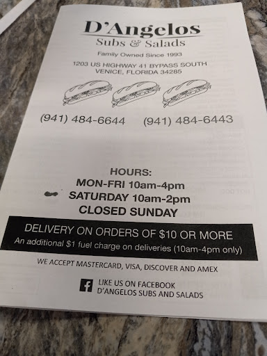Read moreFirst time today ordering from D'Angelo's Subs. I got Elsie's Steak Sub, which is their regular steak sub (onions, mushrooms, peppers and American Cheese) with their homemade sauce added. There wasn't too much in the way of peppers that I could noticeably taste, nor mushrooms or onions for that matter. It was just okay. The sub wasn't heated up to crisp up the bread (at least mine wasn't). The disappointing part for me was when the cashier wanted to charge me an extra dollar for a styrofoam cup of ice water. She ended up giving it to me anyways when I told her I had a bottled water in my car, but still be aware they charge $1.00 extra for a cup of water. $12 for chips and soda with the sub would have been more reasonable as a lot of restaurants do. I paid $12.29 for a 10 inch sub...nothing more than just the sub. Like I said it was just okay, I much prefer Luigi's steak subs (here in Port Charlotte) if I were to get one from a restaurant, and they are a few bucks cheaper. To be honest I prefer...