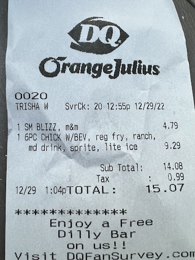 Read moreIf I could put 0 stars I would!! I just left this location and I must say I have NEVER had such poor customer service. I arrived at the drive through about 5 minutes after 11:00am and I spoke to the speaker and no one answered. So I decided to walk inside. When I walked inside, I was not greeted, in fact I received a scowled look from CHRISTINE who was at the front counter. I asked her if the drive thru was operational and she replied with" we're counting money", and she continued to count her change loudly to me, 1,2,3,4 and so on. I stood there and waited for her to finish counting her register. When she was done she looked up at me and rudely said"ok, now what do you want?" At this point I asked her what time they opened, because at this point it was already almost 12 minutes after 11:00. She replied that "they were running late." I have worked in customer service my entire working career and would NEVER treat someone this way. I voiced my opinion to her and she refused to wait on me, because she couldn't handle my feed back. She then turned to the drive thru associate and said" you're going to have to wait on this F*#king woman and walked away.The gentleman that took over for her was pleasant. But nothing could make up for my first impression. Now I understand why there have been a reduction in DQ's across the country if this is the...