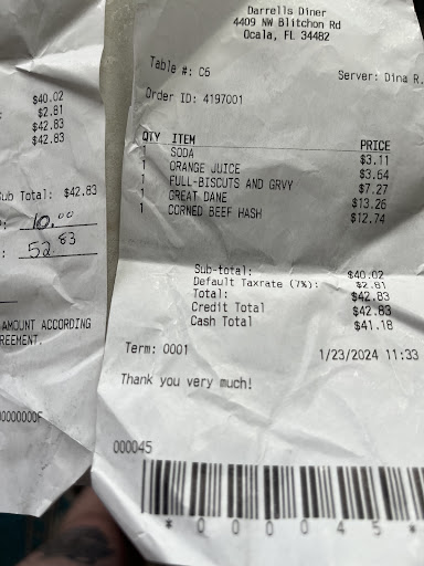 Today I went to Darrell’s Diner. To say the least I was dissatisfied with my breakfast. To start off my wife and I ordered some drinks. The orange juice I ordered tasted like some dollar store off brand. Charging over $3 for a cup. Was never given a straw, or a full glass of OJ, the waitress ran out. Said she would top it off when she came back, but never did. We then ordered some biscuits and gravy, and I was disgusted. Taste… well there was none. The gravy was watered down, clearly to stretch it out which had no taste whatsoever. The biscuits were a joke, I’ve had better biscuits at Waffle House. This biscuit honestly tasted like it was made in a state penitentiary. The reason the atmosphere is 1 star, is for the simple fact that the show Supernatural was on the TV in front of us. While I’m eating there is a man hanging himself on said show. Not really the vibe I’m looking for while eating. Or is it a family environment. The portions are there, but there is absolutely NO FLAVOR, OR LOVE in this cooks kitchen. Their prices are ridiculous, I just wished there was more quality than quantity with the food. I spent over $50 there, and regret every second I stepped in there and sat down. Would of got a better breakfast at McDonald’s and thats saying something. DO NOT… DOOOO NOT GO HERE IF YOU LIKE SEASONED, GOOD FOOD. But if your palette is bland you’ll love it here. I WILL NOT BE RETURNING TO THIS ESTABLISHMENT.
