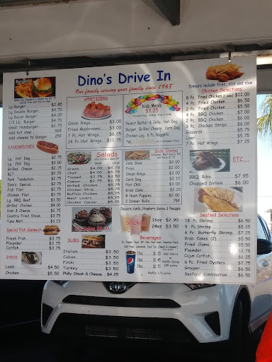 The first time we stopped in it was about 80 degrees perfect weather, and did we have fun. They need 50s diner music. I love this place. The servers are all wonderful as they hustle to take your order from a hanging sign or the monthly special of chicken fried steak mashed potatoes and rice and green beans. I love this dish. 😀 eating in my car isn't ideal but the food is good and it's cheap. We try something new every time we go anywhere so we have had a lot of new things. Salads are great, not bagged lettuce. So, msg isn't keeping it fresh. The cheeseburger and fries are enough for 2 people 😋 the whipped potatoes are so good that they are perfect. You get a lot, and you leave full and have some extra money leftover. The fish sandwich is my Dad's favorite fish he's 93 so this is high praise from a man who bought a home on a lake and every weekend we went to the fish place Dinos is far better than anything else. The girls serving up the food dishes understand we want to eat, and we want it now. They are friendly and efficient. They all are nice and all beautiful. They are well trained.they all help each other.give Dinos a chance, but the onion rings are too greasy for my stomach. Look in the different color food coupon books Dinos is in there and so is his entire menu. For Dino's, I give them 5 stars. They are great in their class of restaurants. The place is clean and organized. They stay in their lane and do it well. Don't expect a steak and baked potato when you are at a drive-in. They have tasty fresh food, and prices are good and fair. I hope you will enjoy it put on some 50s music and go for a Saturday dinner. I'm sorry if there are type-os. My eyes are really...